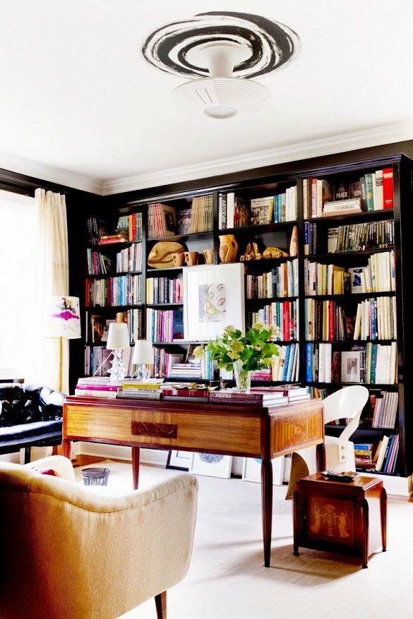 Built in bookcases behind the dining table reverts from functional office to personality filled dining room with a clear of the table”