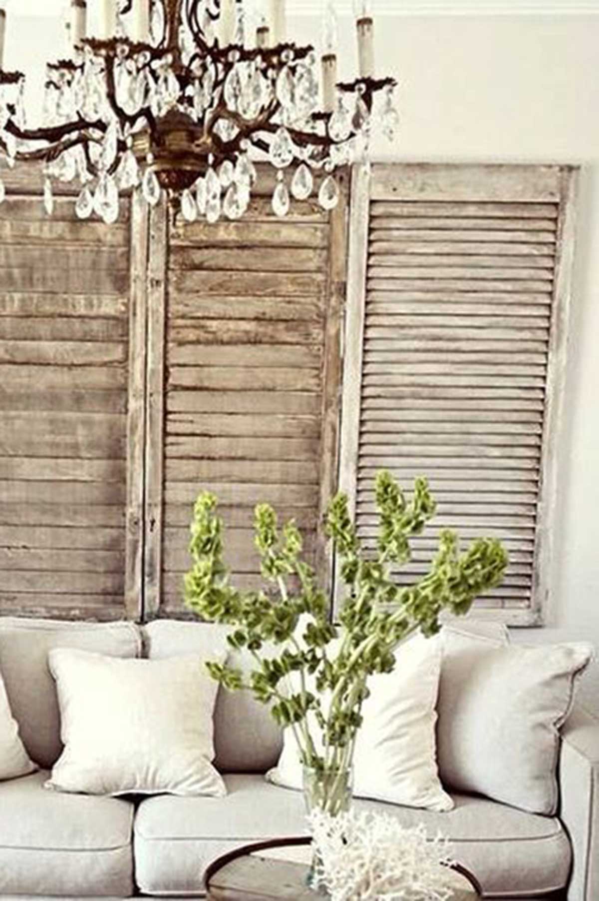 The paradox of old, weathered wall hangings can make an intense statement in an intimate environment. Large prints of classic artworks, vintage posters, or block-colour artworks will look at home in your lush space. Antique shutters, doors and ladders against walls create simple, rustic hangings.