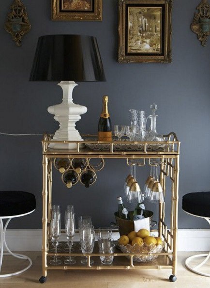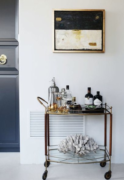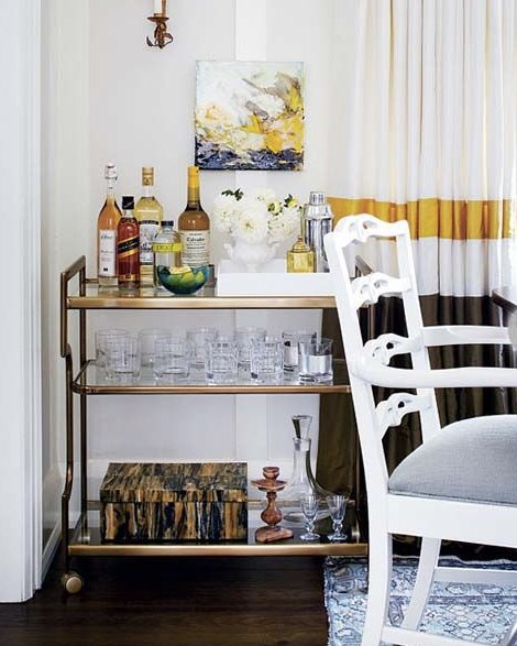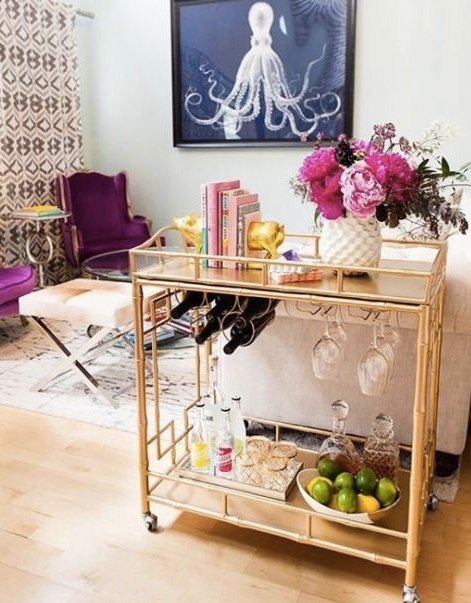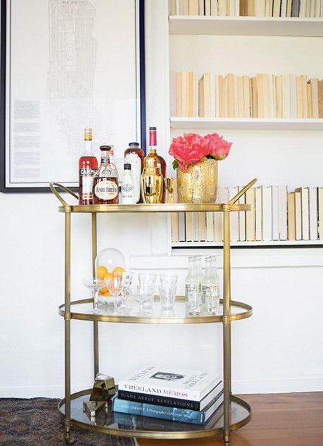 Bar carts also make for greatstorage place for extra books you dont have room for. Old books or design books add lots of flair to a bar cart.